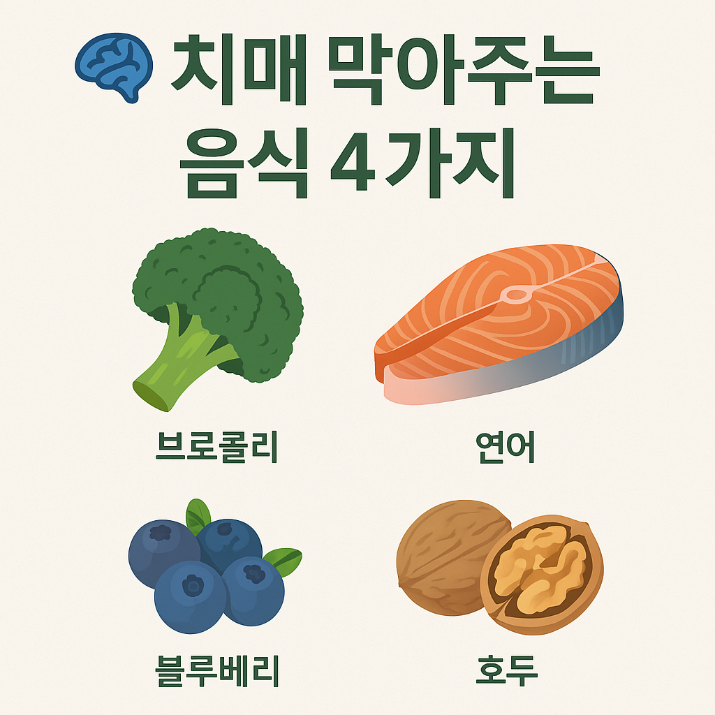 약물보다 더 먼저 시작할 수 있는 예방법, 바로 **식단 관리**인데요. 오늘은 뇌 건강을 지키고 치매 예방에도 효과적인 음식 4가지를 소개할게요. 매일 식탁에 올릴 수 있을 만큼 간편한 재료들이에요 🙂