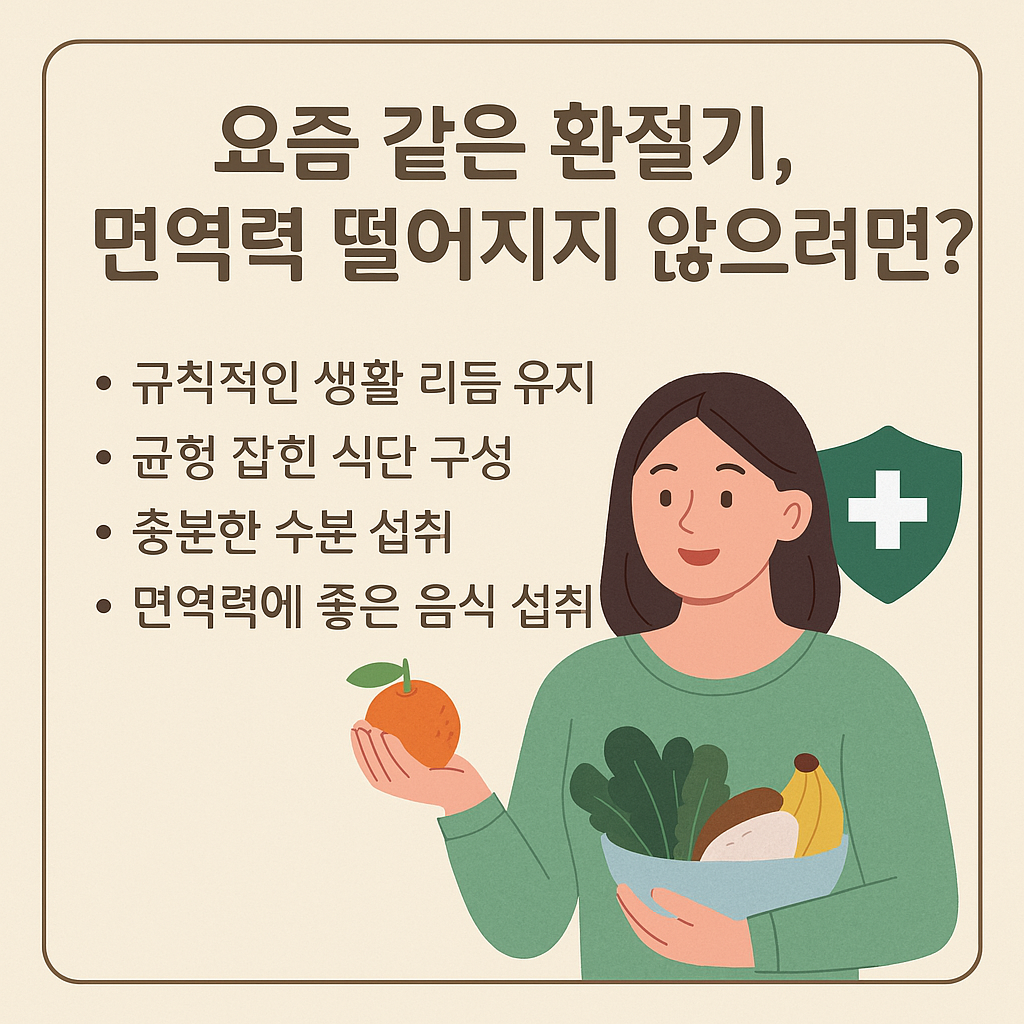 요즘 아침저녁으로 쌀쌀하다가 낮에는 또 따뜻해지는, 참 애매한 날씨가 이어지고 있죠? 이런 환절기에는 감기부터 피부 트러블까지 다양한 몸의 이상 신호가 나타나곤 해요. 그래서 오늘은 "환절기에 면역력 떨어지지 않게 지키는 법"에 대해 이야기해보려 해요.